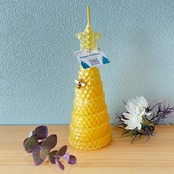 クリスマスツリーのみつろうキャンドルです。みつろうキャンドルとは、はちみつを採取した後の蜂の巣を溶かして作るろうそくのことです。原料は蜂の巣だけなので、はちみつ色の黄色をしています。100%蜜蝋だけで作ったキャンドルは、ひとつひとつ丁寧に手作りで作っています。