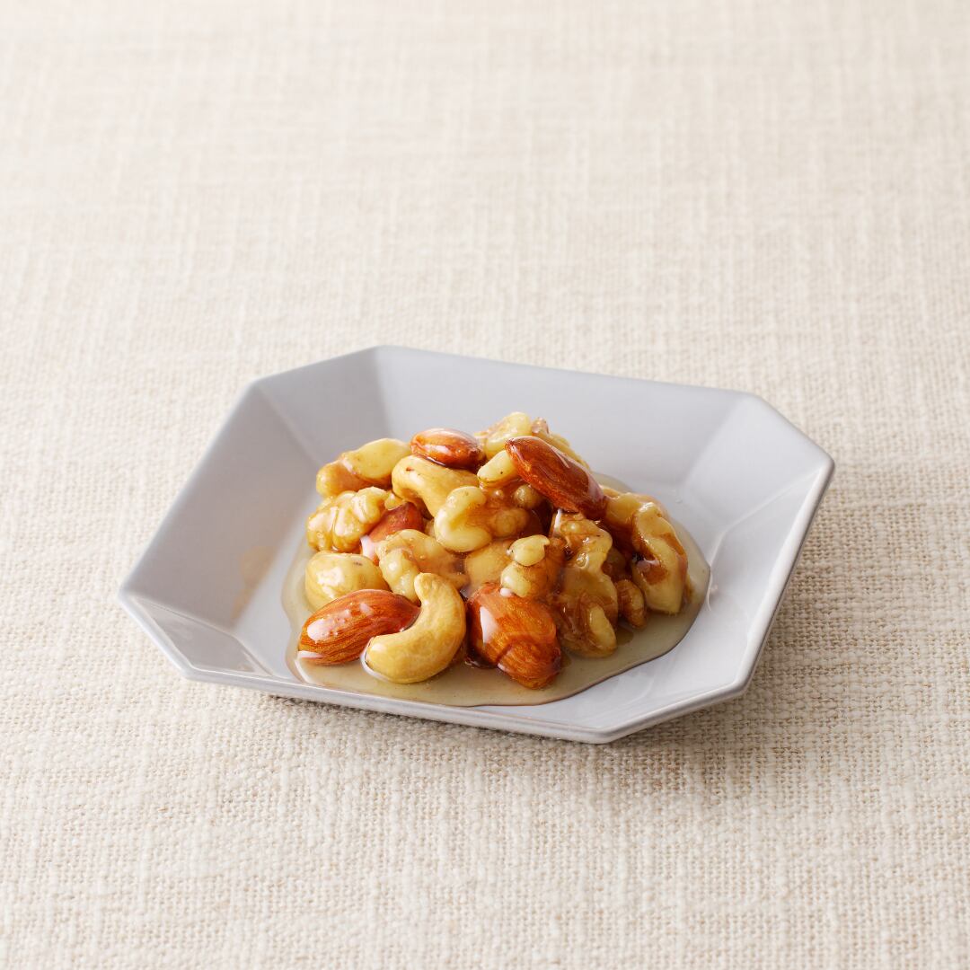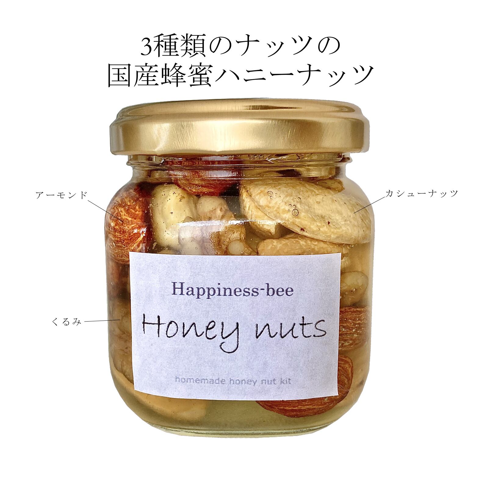 ハニーナッツとは、ナッツの蜂蜜漬けの事。しっとりと蜂蜜が浸み込んだナッツのジューシーな味わいがたまりません。ナッツは5つ星ホテルでも提供されるAクラスのくるみ、アーモンド、カシューナッツを使用しています。職人さんが手作業でそれぞれのナッツに合わせて焙煎しています。コーヒーのお供として、ワインのお供としてご褒美スイーツとしてお召し上がりください。